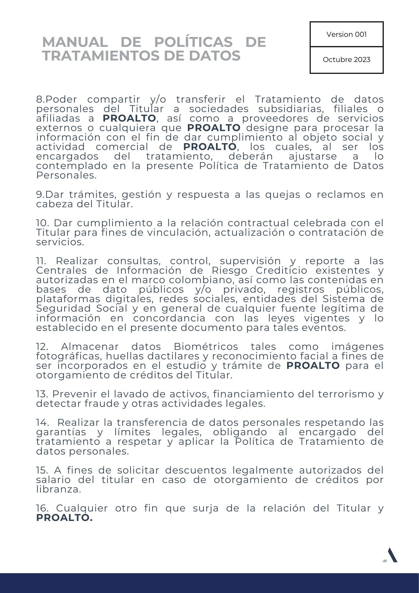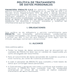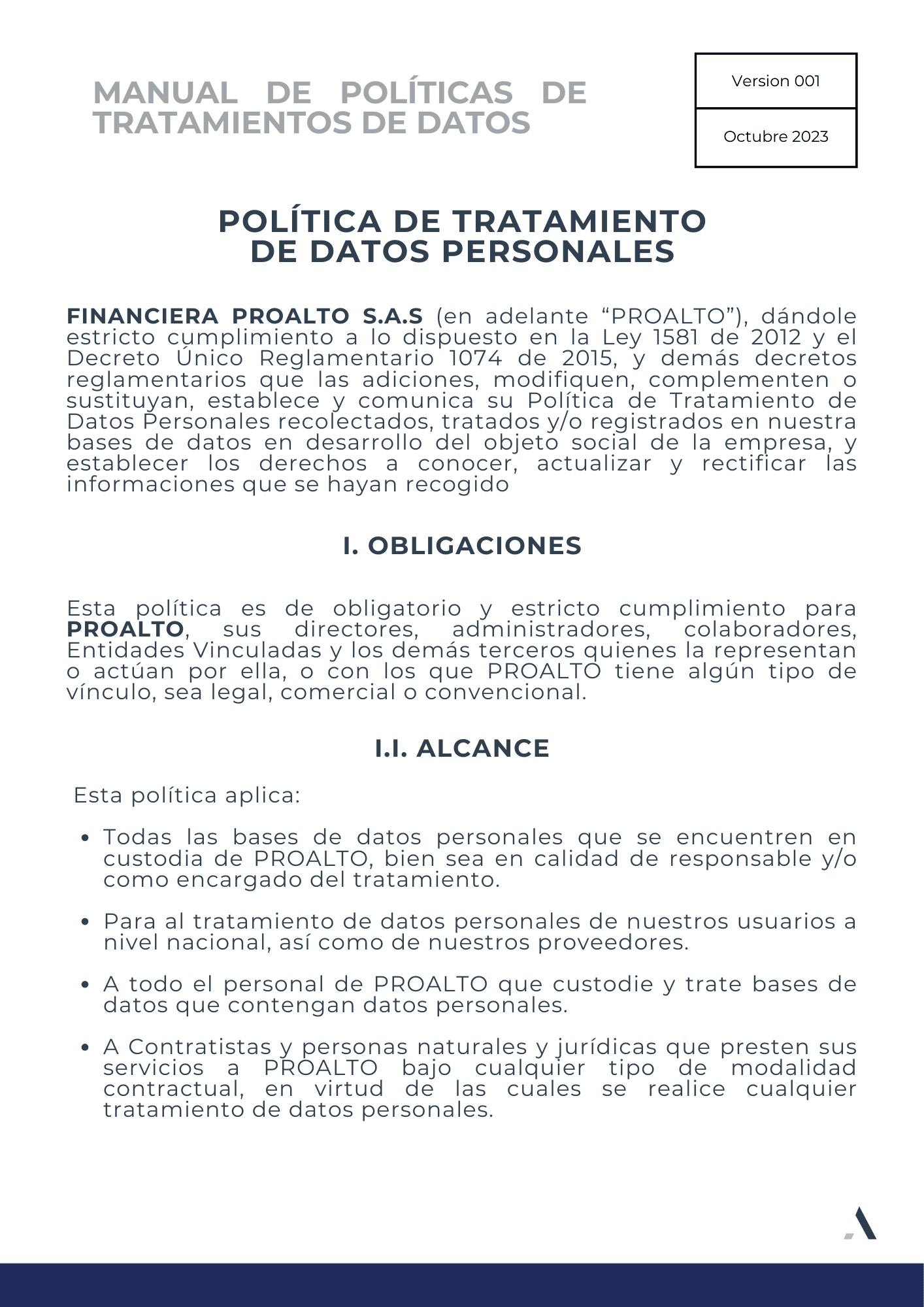 FINANCIERA PROALTO SAS aplicables al tratamiento de datos personales recolectados, tratados y/o registrados en nuestras bases de datos en desarrollo del objeto social de la empresa, y establecer los derechos a conocer, actualizar y rectificar las informaciones que se hayan recogido.