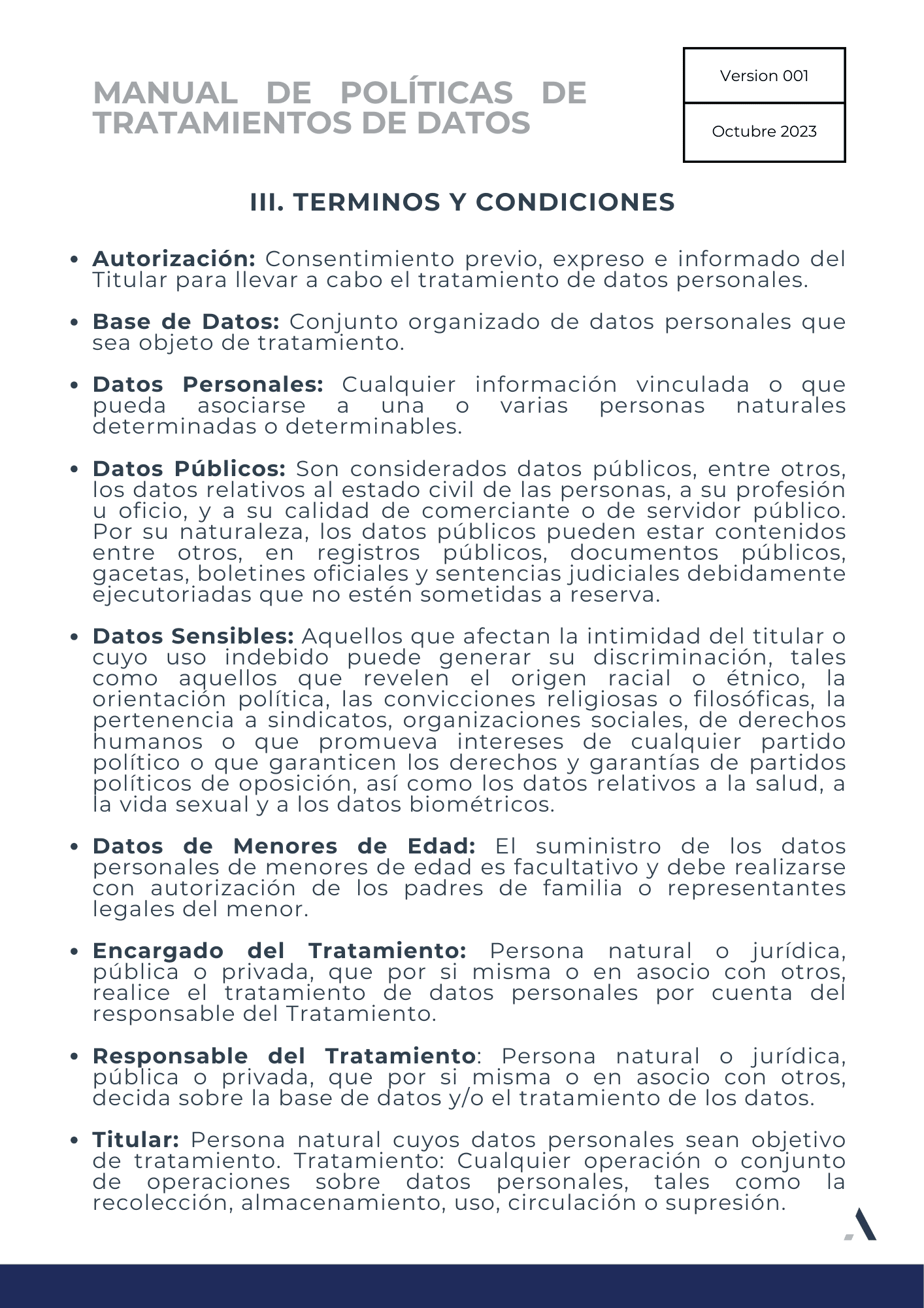 Titular: Persona natural cuyos datos personales sean objetivo de tratamiento. Tratamiento: Cualquier operación o conjunto de operaciones sobre datos personales, tales como la recolección, almacenamiento, uso, circulación o supresión.