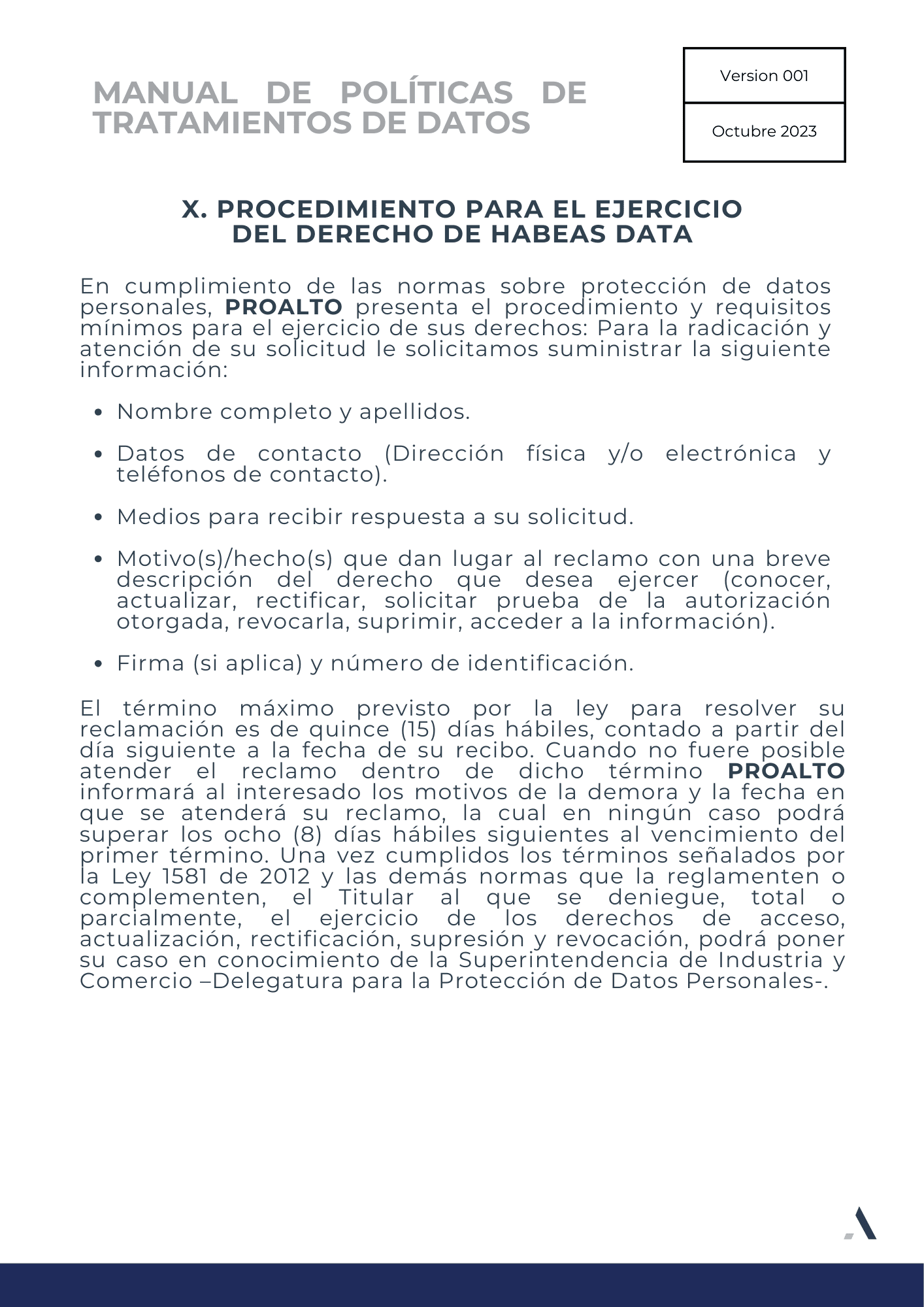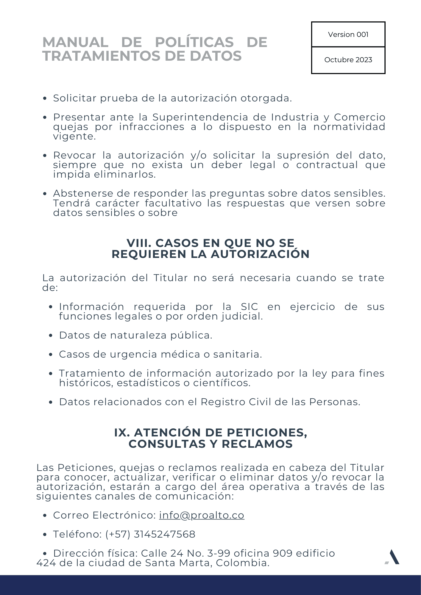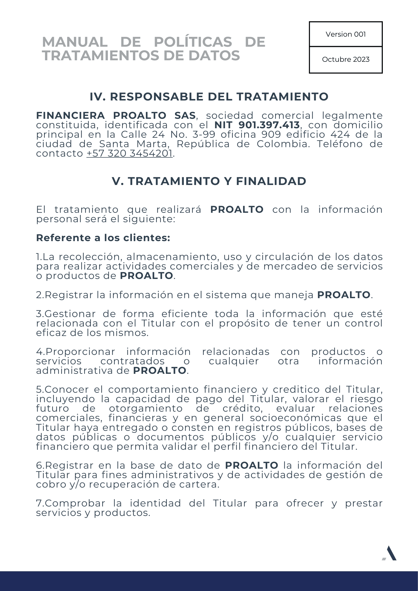 RESPONSABLE DEL TRATAMIENTO FINANCIERA PROALTO SAS, sociedad comercial legalmente constituida, identificada con el NIT 901.397.413, con domicilio principal en la Calle 24 no. 3-99 oficina 909 edificio 424 de la ciudad de Santa Marta, República de Colombia. Teléfono de contacto (57) (5) 4233378.