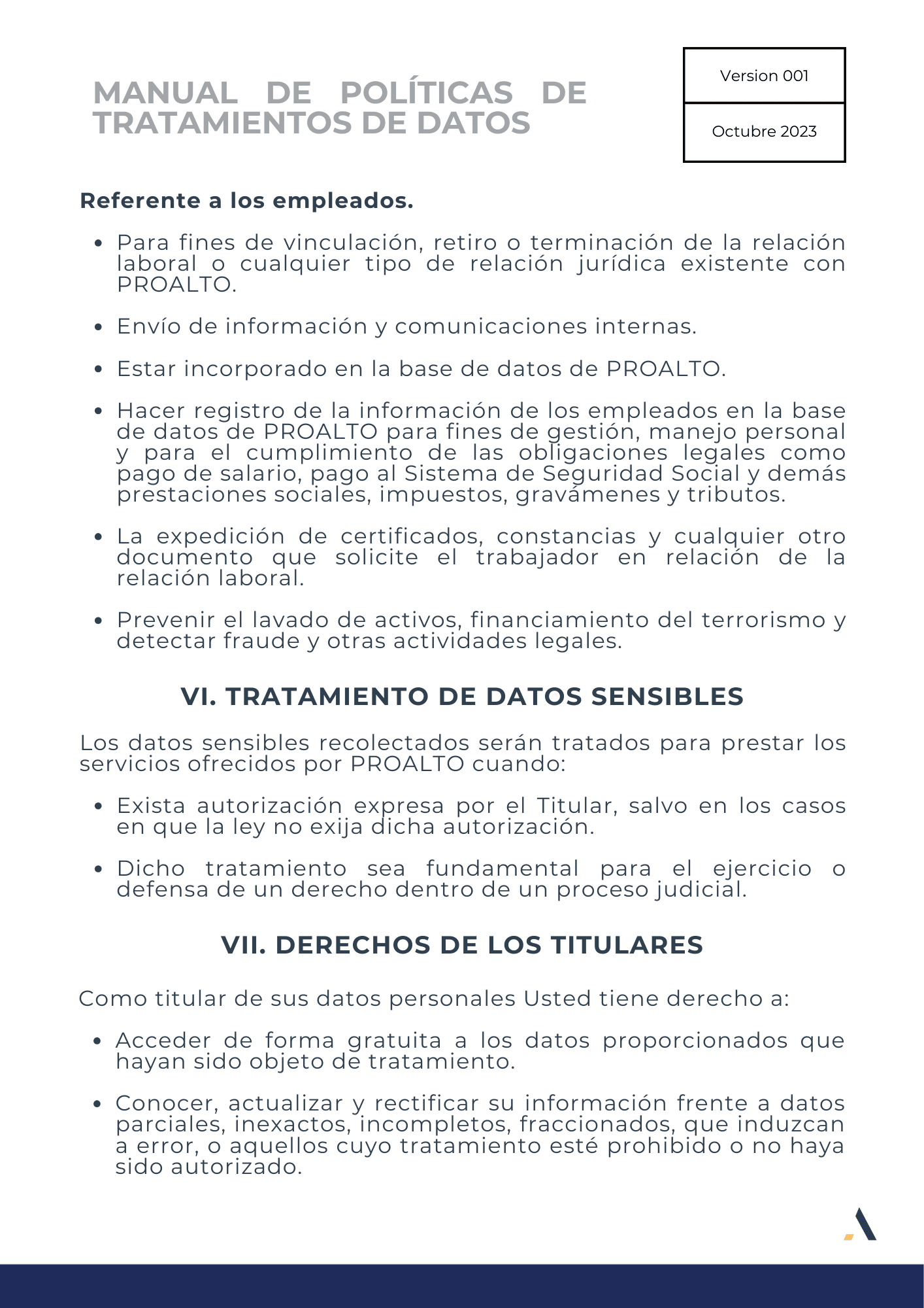 - A todo el personal de FINANCIERA PROALTO SAS que custodie y trate bases de datos que contengan datos personales.